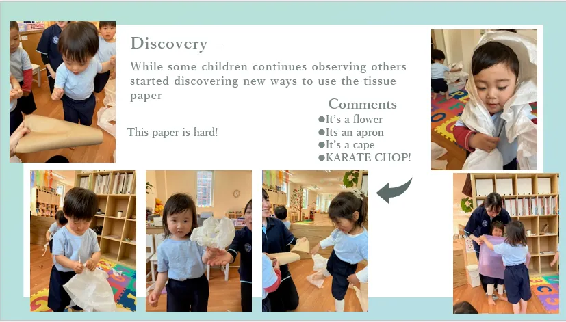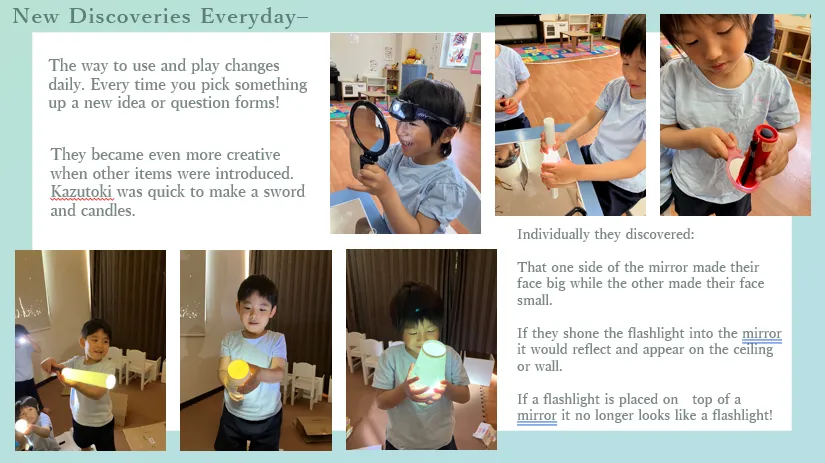 Reggioでは、手鏡やライトを使って日々活動を進めていきました。「自分って何だろう?」と想像したり考えたりして、先生達に伝えることを楽しんでいました。自分の感じたことをそのまま表現していく中で、より自由なアイディアが生まれているようでした。