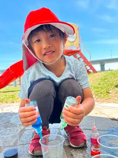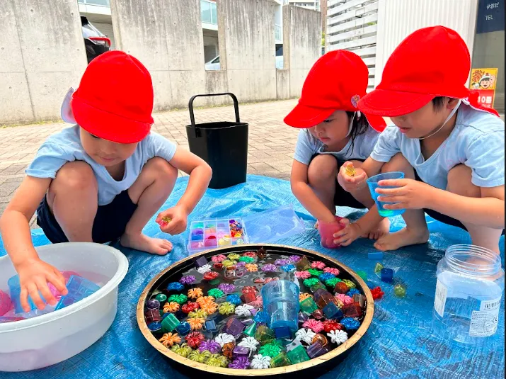 今年の夏も猛暑の予感です。7月22日からプール活動を予定していますが、それに先駆けて水遊びが始まりました。子どもたちは気温が高すぎて長く外遊びができない分、水で涼を取りながらめいいっぱい楽しんでいます。