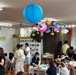 ちょうちんで飾りつけした園内には、お神輿や輪投げ、的当てや工作で楽しめるブースが並びました。